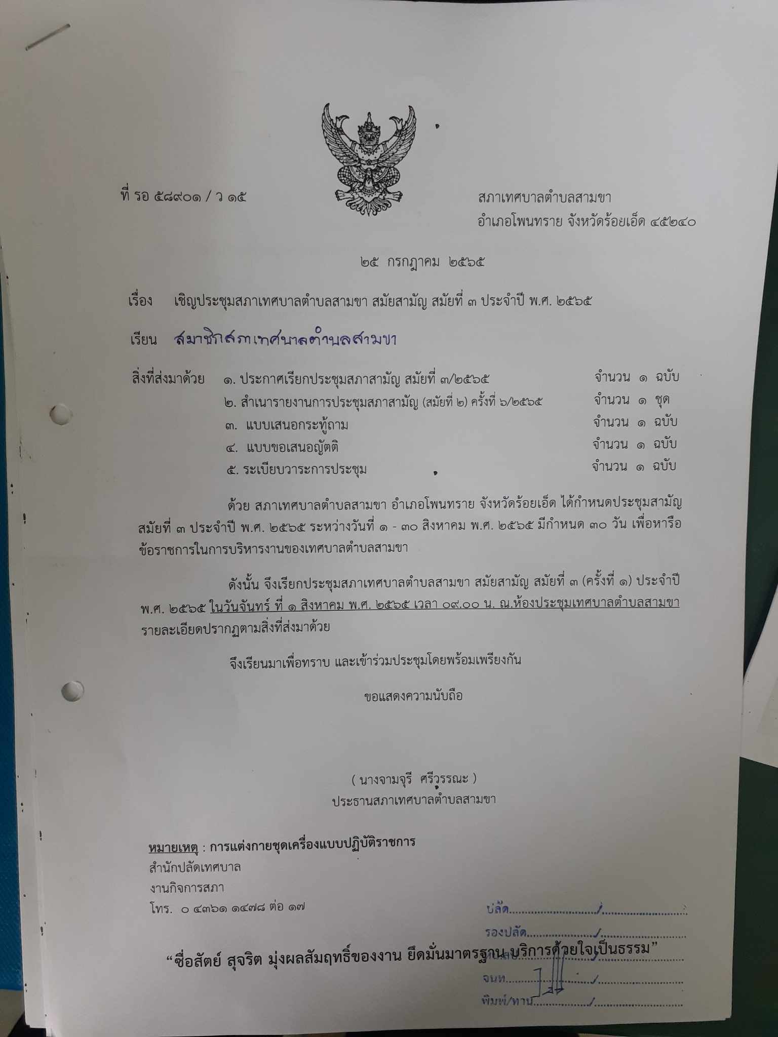 เชิญประชุมสภาเทศบาลตำบลสามขา สมัยสามัญสมัยที่3 ประจำปี2565