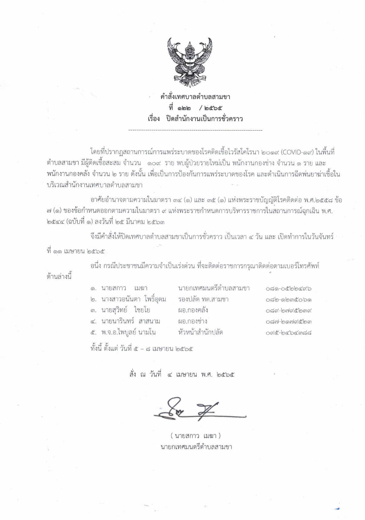 ประกาศปิดสำนักงานเทศบาลตำบลสามขา เป็นการชั่วคราว
