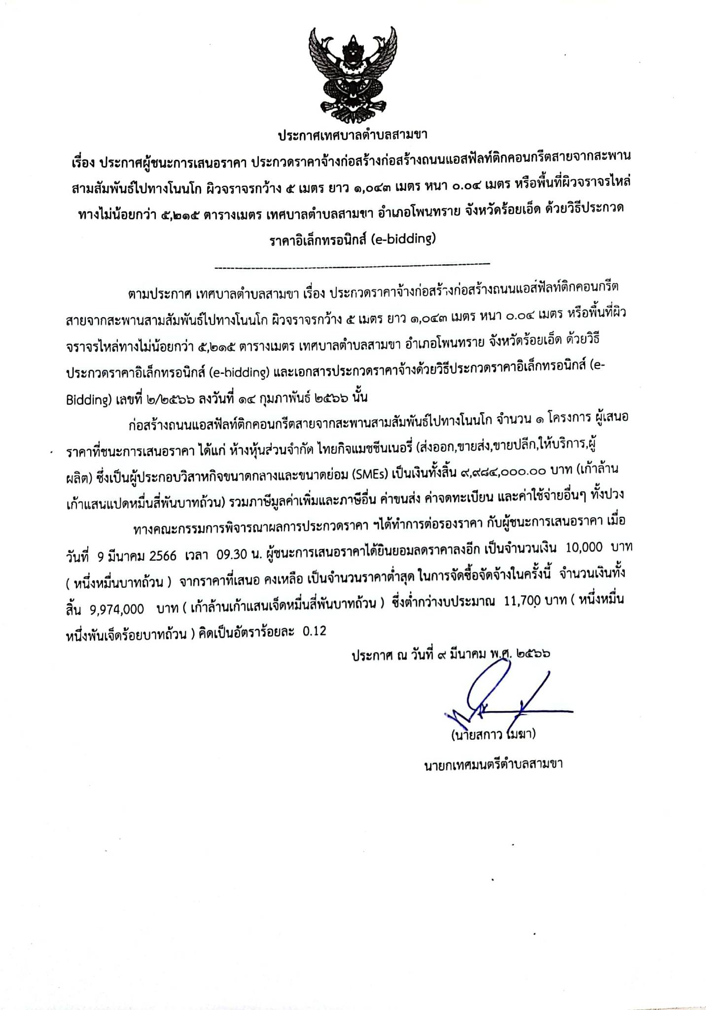 ประกาศเทศบาลตำบลสามขา ประกาศผู้ชนะการเสนอราคา ประกวดราคาจ้างก่อสร้างถนนแอสฟัลท์ติกคอนกรีตสายจากสะพานสามสัมพันธ์ไปทางโนนโก