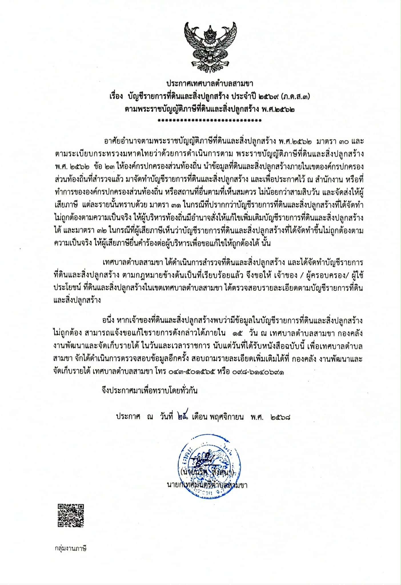 เรื่อง บัญชีรายการที่ดินและสิ่งปลูกสร้าง ประจำปี 2569 (ภ.ด.ส.3) ตามพระราชบัญญัติภาษีที่ดินและสิ่งปลูกสร้าง พ.ศ.2562